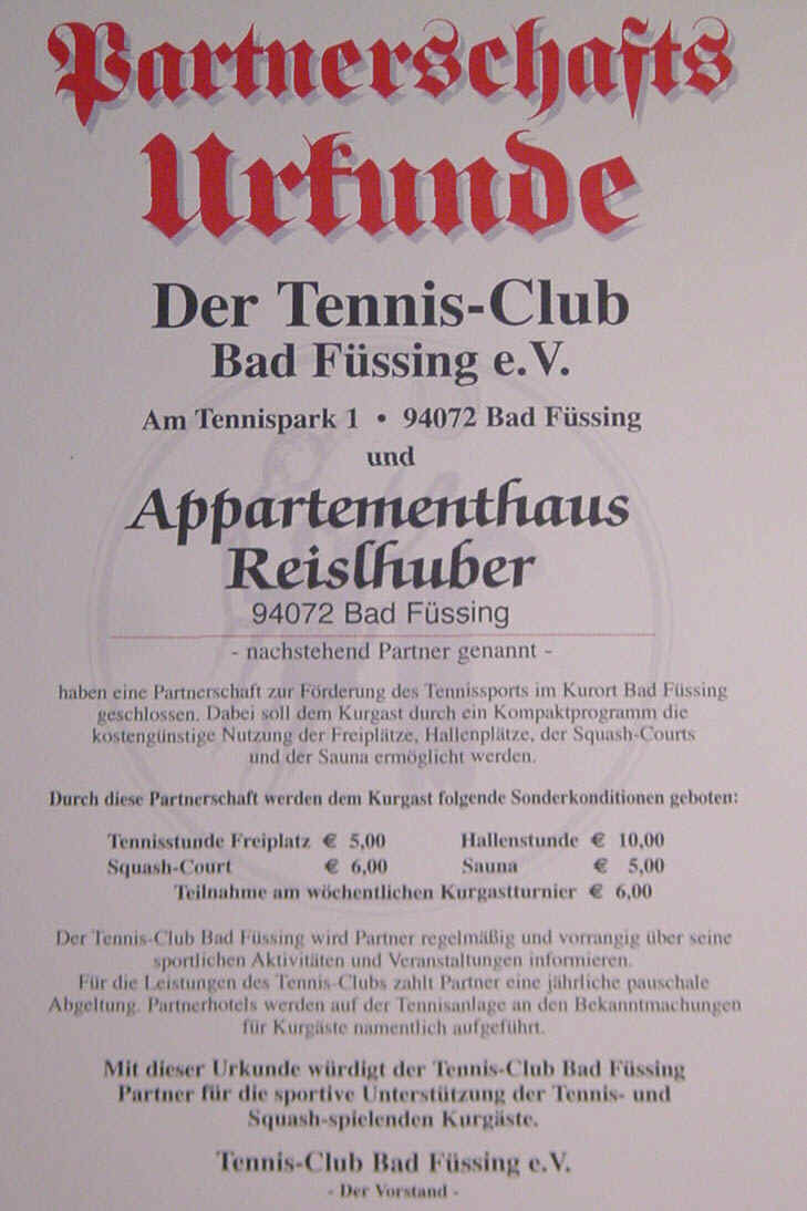 Seit 01.01.2004 sind wir Vertragspartner mit dem Tennisclub Bad Füssing e.V., d.h. die Gäste unseres Hauses erhalten Sonderkonditionen für Frei- und Hallenplatzbenutzung.
